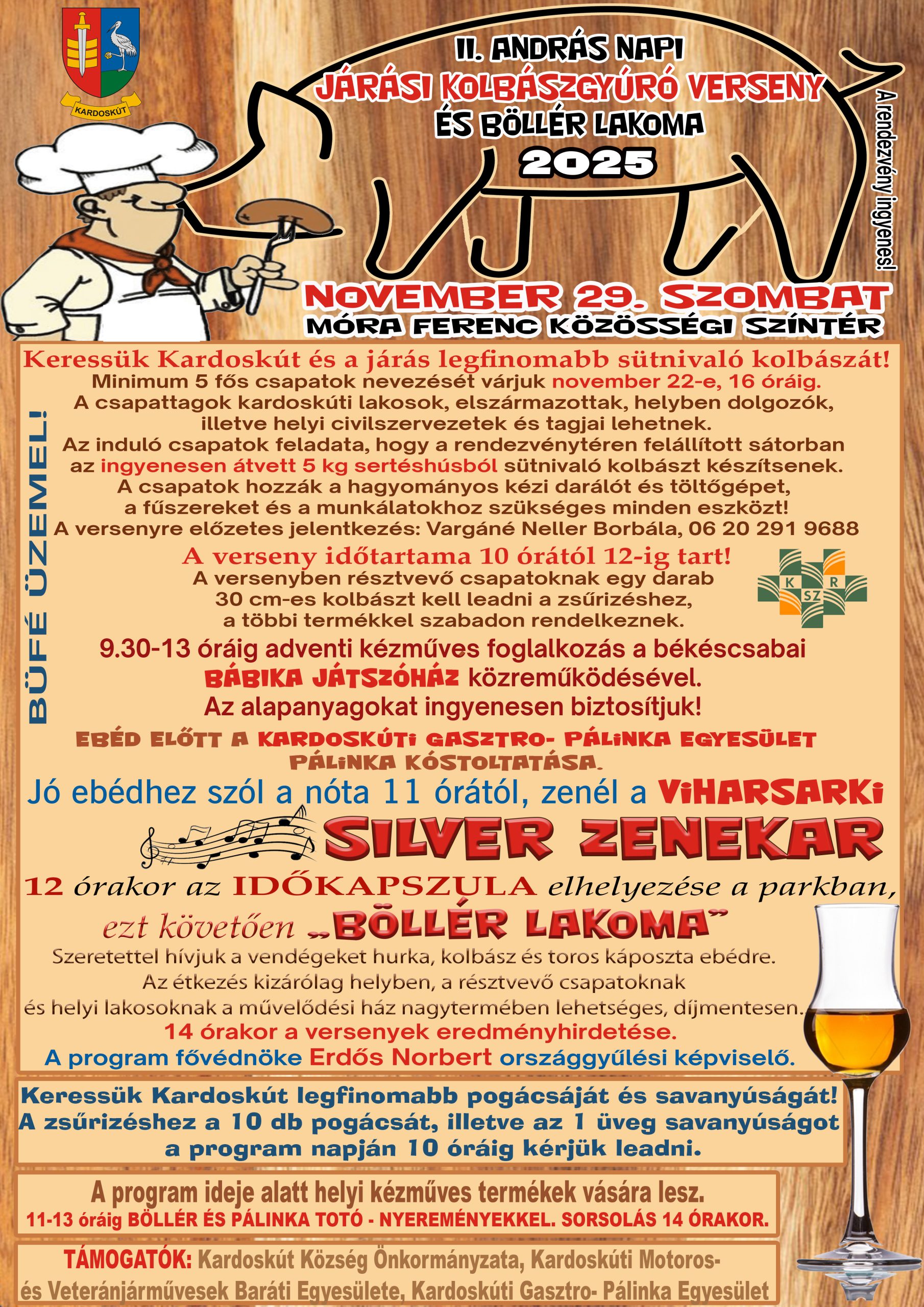Az ünnepi programot követően a közösségi élmény a gasztronómia világában folytatódott. Mórocz Lajos és főzőcsapata a hagyományos ízek kedvelőinek kedvezve helyben készített marhapörkölttel kínálta a vendégeket, amelyet a Sütiműhely feketeerdő süteménye tett teljessé. Az ebédhez Pintér Vilmos szolgáltatta a jó hangulatot élő zenéjével, amely mosolyt és vidámságot csempészett az asztalok köré, többen táncra is perdültek.