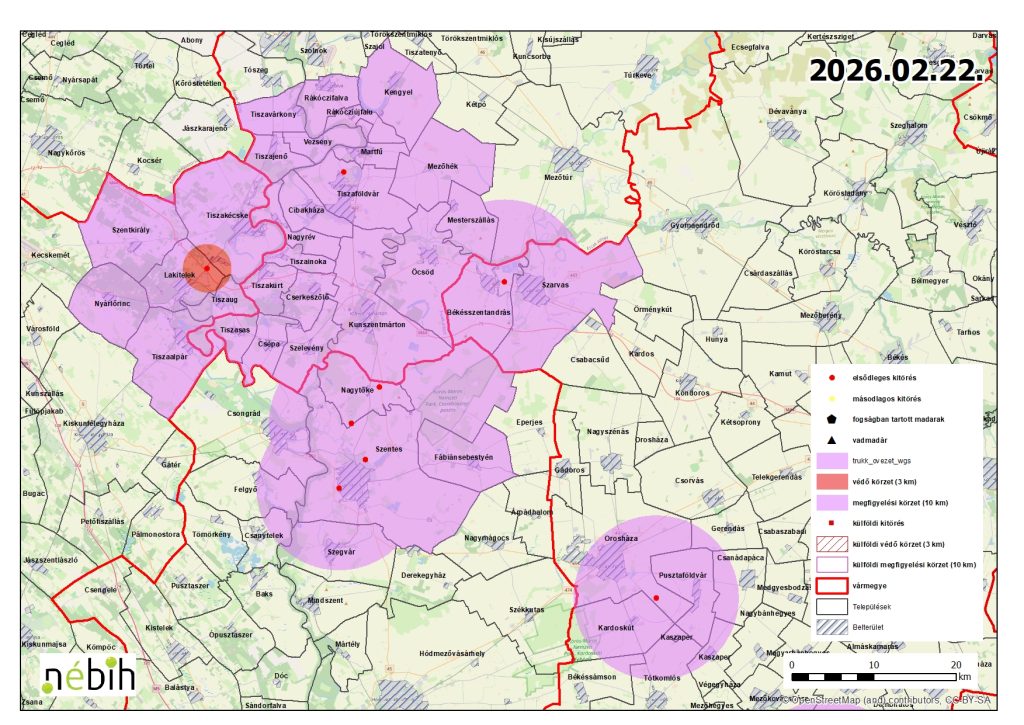 jelölt kitörési pontok körül, 3 km sugarú körben, Kardoskút, Orosháza és Pusztaföldvár települések érintett közigazgatási területére vonatkozóan, a BE/23/85-3/2026. számú határozattal magas patogenitású madárinfluenza fertőző állatbetegség megállapítása miatt elrendelt védőkörzetet